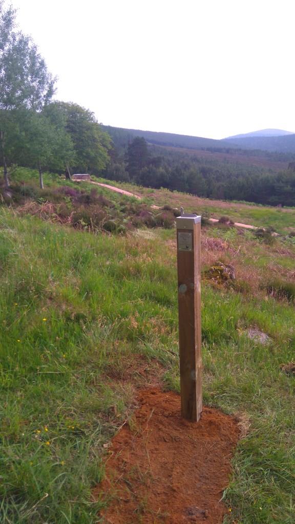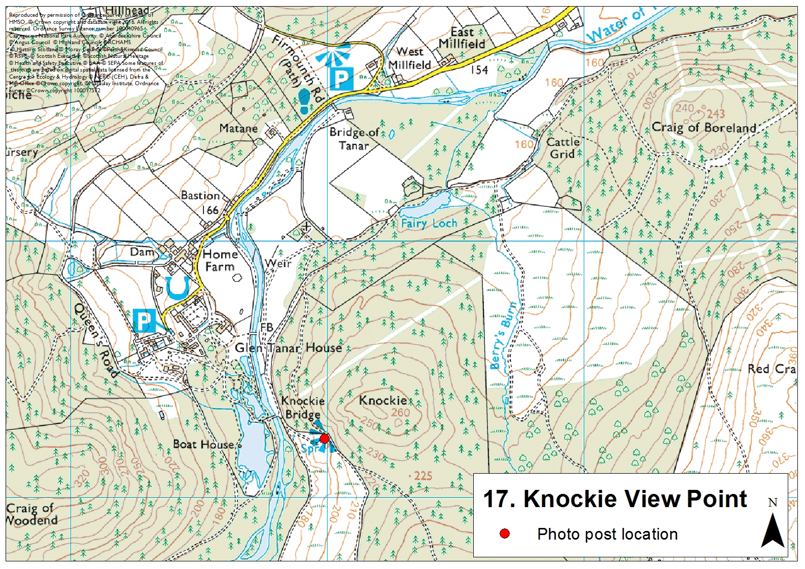 The Knockie Viewpoint is on a marked trail; maps are on display in the Bridge of Tanar car park and Ranger Station and available here. Distance from the car park is about 1.5km and is easy walking with a short climb to the view point. The photo post is on the opposite side of the footpath from the viewpoint.