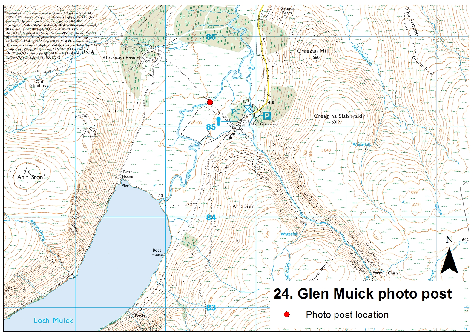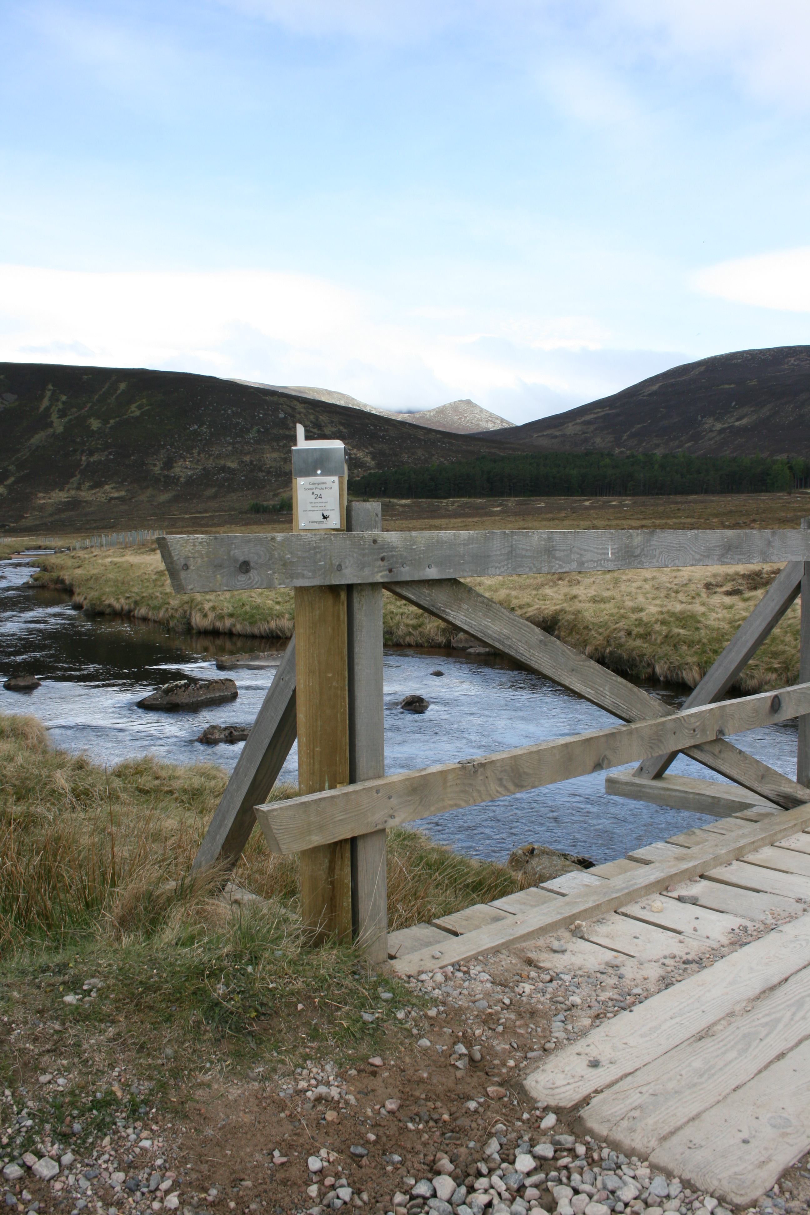 Park at the visitor car park at the end of the public road and head towards the cluster of buildings called Spittal of Glen Muick. Here you will find the visitor centre. Take the track on the right signposted Lochnagar. The photo post is attached to the bridge over the river Muick a few hundred metres along the track.