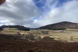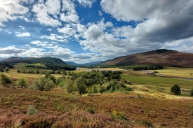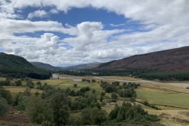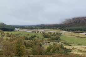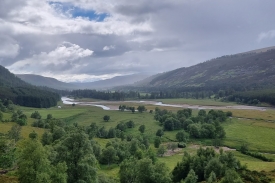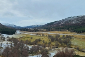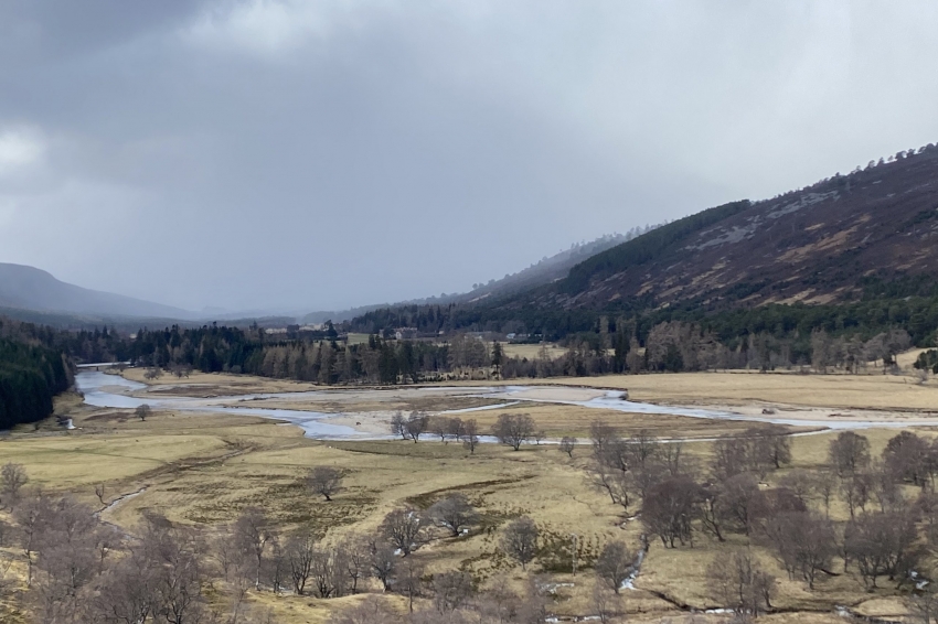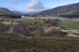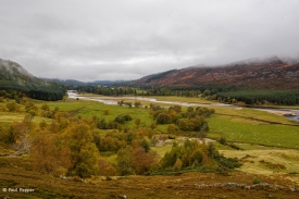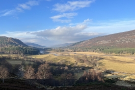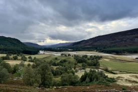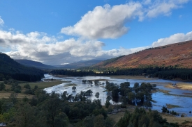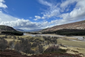 A spectacular view of the River Dee, looking up the strath towards Mar Lodge and the hills and woodland of Inverey. Photographs taken here will record changes to the river as it braids across the floodplain, woodland regeneration and restructuring of commercial forestry.